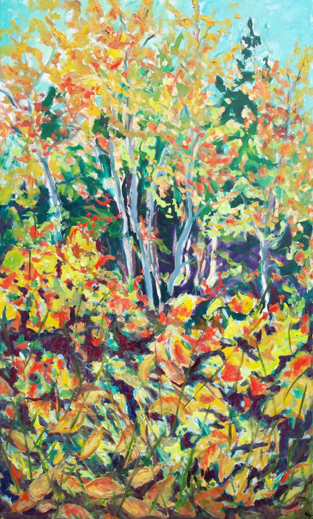 Bert’s re-wilding paintings of 2010 to 2014 can be broken into two main series, Summer Grasses and Bush Wall. The Summer Grasses series were painted with Bert sitting amongst the tall wild field plants. The Bush Wall series consists of paintings of the trees as they advanced into the previously cleared field.